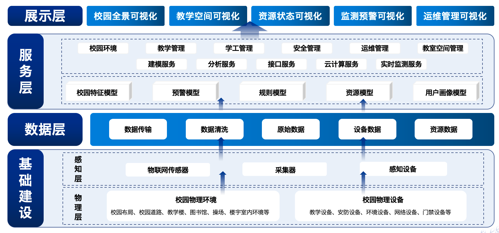 平台基于3D数字仿真渲染引擎、业务数据可视化数据中心为核心,通过接入物联感知设备、地理空间数据、教学业务系统数据、空间运维数据等,实现数字孪生校园的场景虚拟还原,校园综合学情管理、校园沉浸漫游、教学动态管理、设备资产运维管理等校园应用场景。
