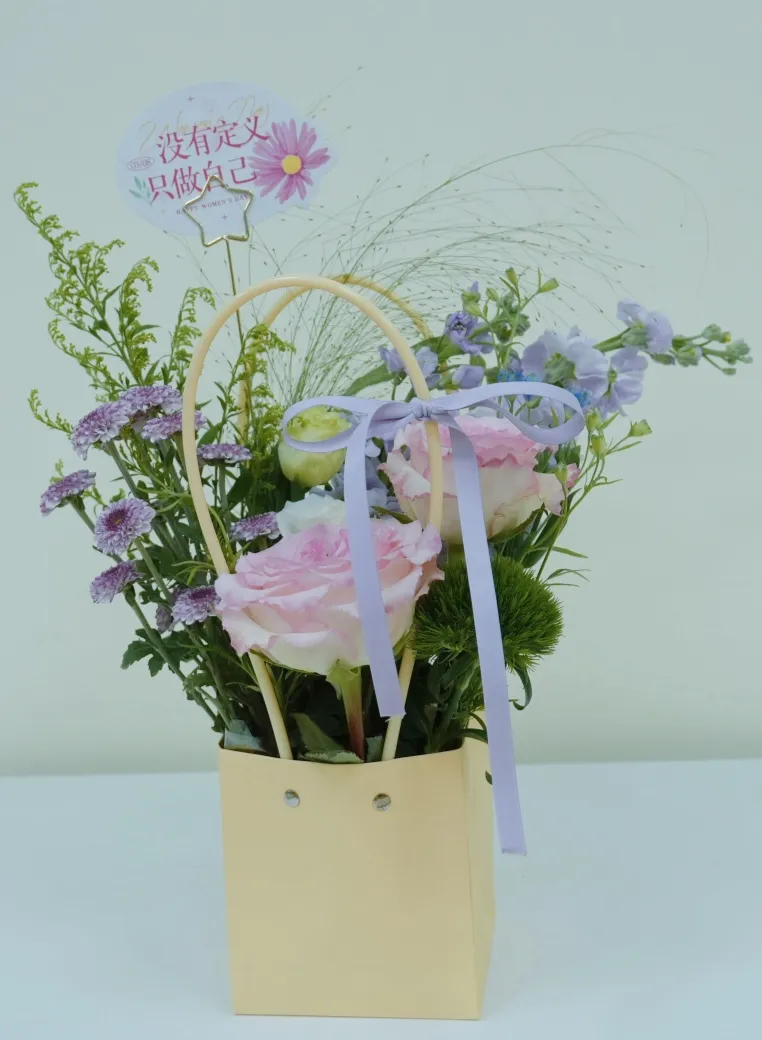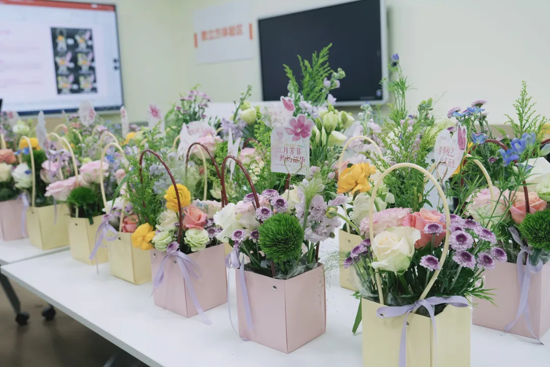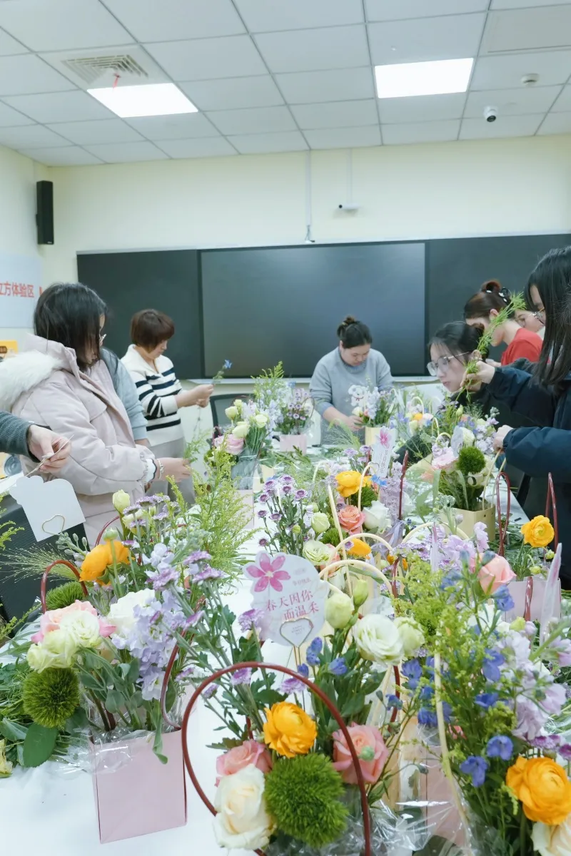 在花香萦绕中,大家随心搭配色彩、修剪枝叶、构思造型,将一枝枝鲜花创作成独一无二的花艺作品。一篮篮错落有致、生机盎然的插花,既是指尖的艺术,更是女性温柔与创意的生动展现。