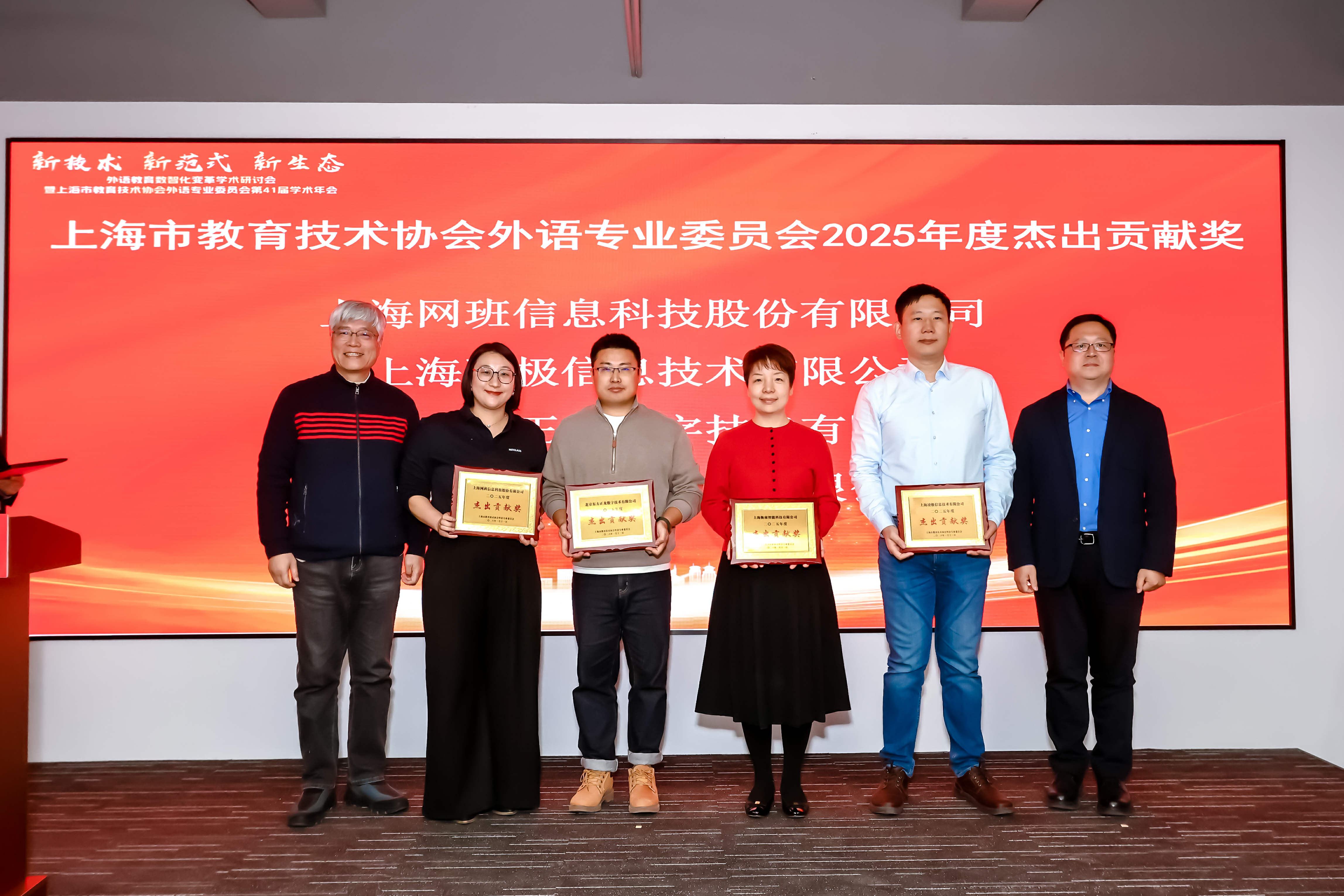 演讲结束后,年会现场举行了隆重的颁奖仪式。为表彰在推动外语教育数智化转型、深化产教融合、创新教学技术与场景应用等方面作出突出贡献的企业,上海市教育技术协会外语专业委员会授予上海衡南智能科技有限公司 “2025 年度杰出贡献奖”。